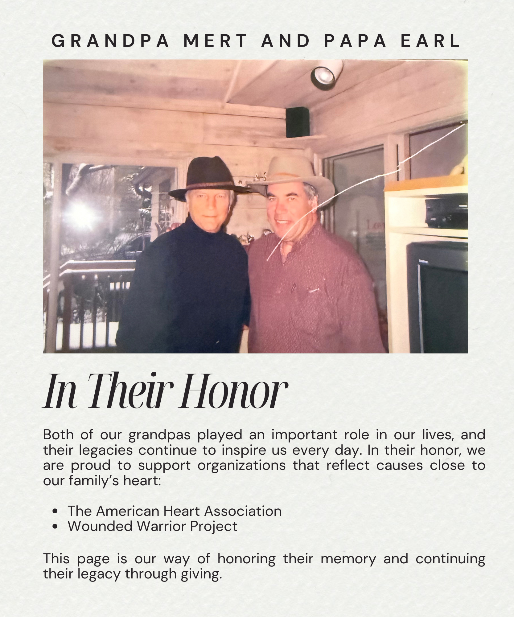 Second Line Studio is not a nonprofit organization. Donations collected through this page will be distributed to the Wounded Warrior Project and the American Heart Association in honor of our grandpas.